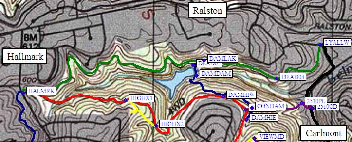 Connects the Lake Trail (at waypoint DAMLAK) and the High Trail (at waypoints DAMHIE or DAMHIW) by going across the dam (waypoint DAMDAM) at the east end of Water Dog Lake.
