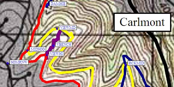 If you want to do short steep 15-minute laps, combine Rocky Road with the Ditch Trail and part of the Middle Trail, connecting waypoints CRLEND, DITCHJ, SMRMID, RCKHIG, RCKMID, and back to CRLEND.