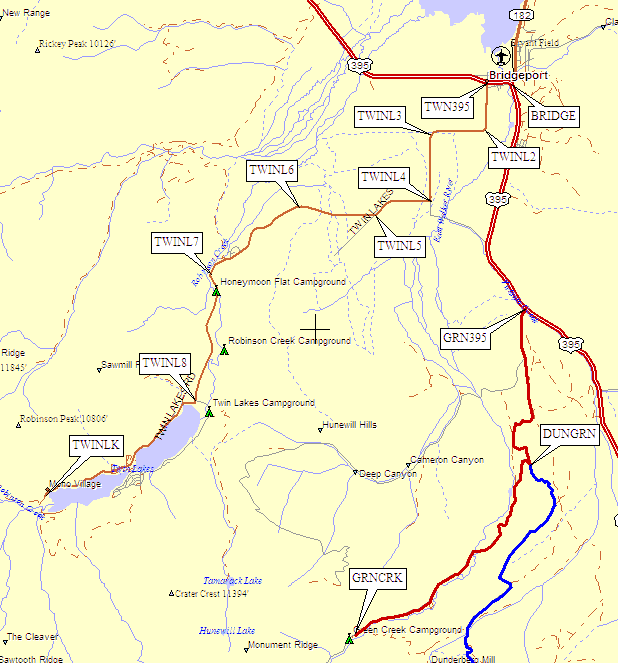 Leave Hwy 395 in Bridgeport at waypoint TWN395, about half a mile west of the intersection of Hwy 395 and Hwy 182 (waypoint BRIDGE). Follow the paved road to Mono Village, near waypoint TWINLK, where parking is free for dayhikers but you have to pay if you're staying overnight. Signs say your car will be towed away if you don't pay.