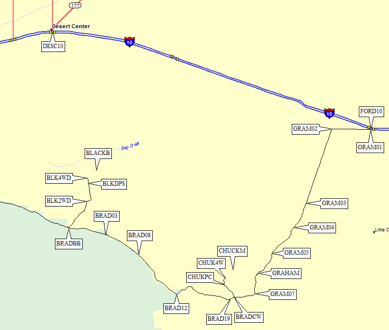 Drive east of Indio on I-10, 14 miles beyond the Joshua Tree exit (waypoint COTJ10) and 10 miles before Desert Center (waypoint DESC10). Exit at the large green sign for Red Cloud Road (waypoint REDC10) and find the large parking area south of the freeway. If you're driving west, you'll have to loop under the freeway west of the exit and go back east to join the eastbound exit ramp. At the south end of this parking lot there is a sign for Red Cloud Road, which goes southeast. Cross under the powerline (waypoint REDPWR) on a dirt road that is still OK for passenger cars.