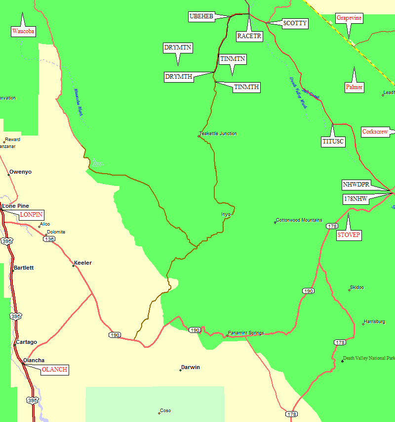 Take your favorite route to Death Valley, specifically Stovepipe Wells (waypoint STOVEP), then take Hwy 190 (which is also Hwy 178) northeast to the junction with the North Hwy (waypoint 178NHW, where 178/190 turns south to Badwater). Turn left (northwest) on North Hwy, going past the turnoff to Daylight Pass (waypoint NHWDPR). Continue about 30 miles north to waypoint SCOTTY, where North Hwy turns northeast to Scotty's Castle and and Scotty's Junction, and turn left (west) on Death Valley Road toward Ubehebe Crater and The Racetrack.