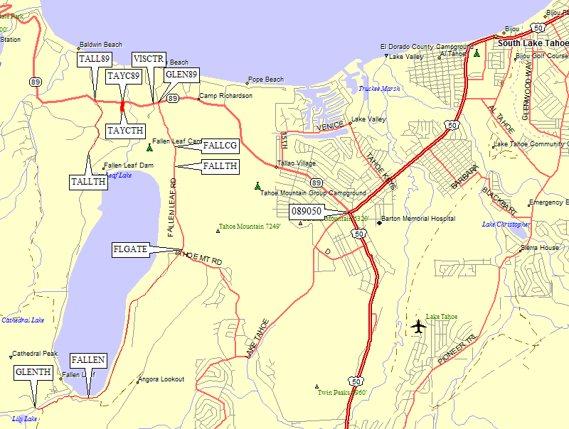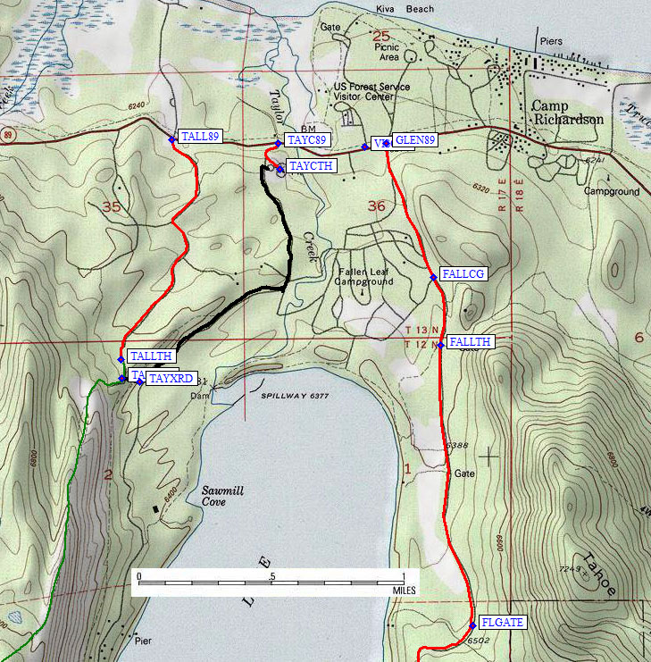 There is a gate across the road which goes from the Sno-Park turnoff to homes along the west shore of Fallen Leaf Lake. To reach the trail up Mt Tallac, follow that paved road about 1.2 miles past a large meadow to another small meadow where the road turns sharply left. Here there is a small post and an unmarked use trail (waypoint TAYXRD) which leads you up to the trail (waypoint TAYXTR) just above the Mt Tallac trailhead (waypoint TALLTH).
