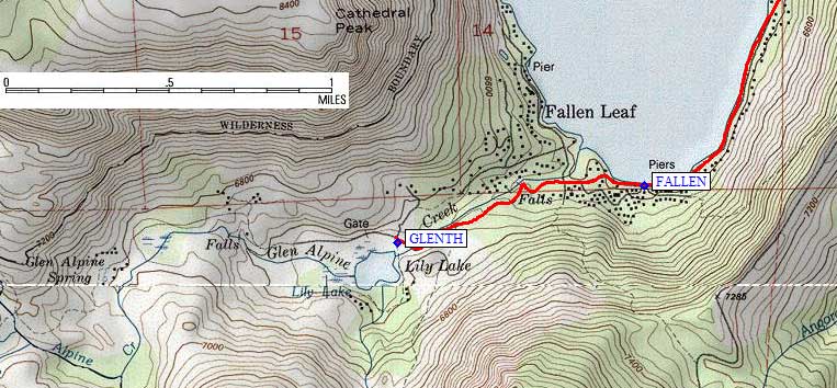 In the summer you can drive all the way to the south end of the lake, through quite a few houses and the city of Fallen Leaf (waypoint FALLEN), eventually arriving at the Glen Alpine trailhead (waypoint GLENTH) which sports some bathrooms but no running water. Not bad for a free trailhead! In the summer or late spring Glen Alpine is a great place to start, with a nice walk to Gilmore or Half Moon lakes on your way to a one-day loop of Jack, Dick, and Tallac.