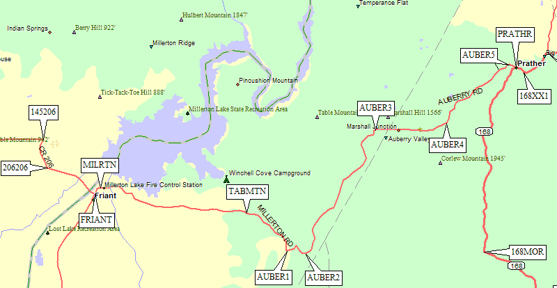 one of two places where Auberry Road intersects Hwy 168.