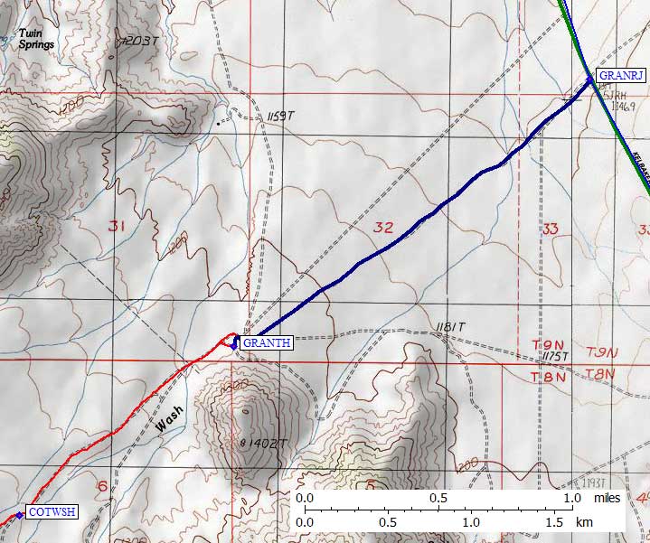 from the pavement (waypoint GRANRJ) to the staked end of the road