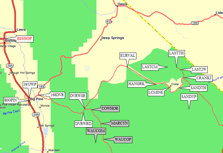 Starting just north of the center of Big Pine, turn east toward Westgard Pass on Hwy 168 (waypoint 395JWP). Then turn southeast on Death Valley Road (at waypoint 168DVR) which is paved at this point. Follow it past the turnoff to Waucoba (waypoint DVRWSR - the Waucoba-Saline Rd) to Eureka Valley where the pavement ends (at waypoint EURVAL). A good dirt road crosses the valley and climbs into Hanging Rock Canyon where rough pavement starts again (waypoint HANGRK). The road changes to dirt again at the top of the hill, near the mines at waypoint LCMINE, and gets rougher.