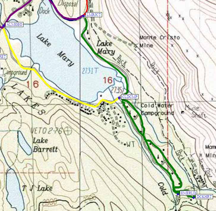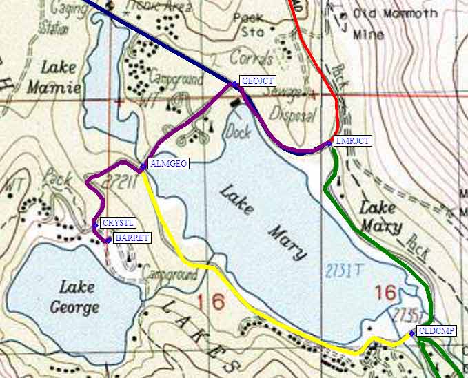 From the Lake Mary Junction (waypoint LMRJCT) drive a third of a mile northwest to the intersection where George Lake is a left turn (waypoint GEOJCT). Another third of a mile brings you to a 'T' intersection where George Lake is a right turn (waypoint ALMGEO), and Around Lake Mary Road is a left turn (which takes you around the west/south shore of Lake Mary to Cold Water Campground).