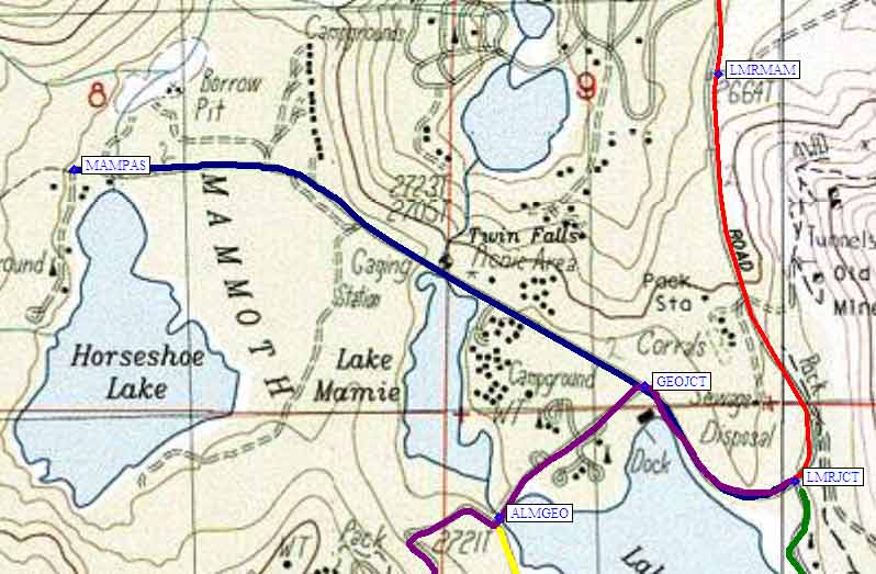 From the Lake Mary Junction (waypoint LMRJCT) drive one and a quarter miles west-northwest to the northern tip of Horseshoe Lake. You'll recognize the trailhead for Mammoth Pass (waypoint MAMPAS) by all the dead trees around it! This area has CO2 (carbon dioxide) leaching up through the soil, and there are warnings that you shouldn't camp in the area.