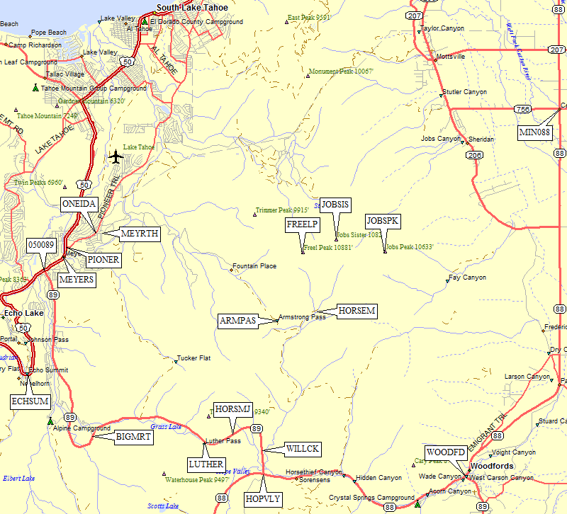 Freel Peak, Jobs Sister, and Jobs Peak can be approached from the town of Meyers (as described below) or from Hope Valley, both south of South Lake Tahoe but on opposite sides of Luther Pass. Scroll down for details!