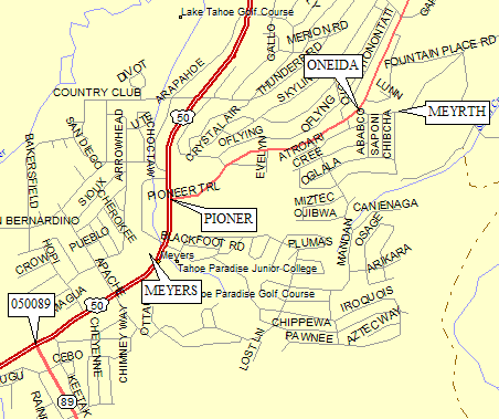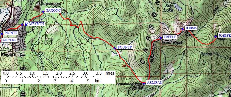 From the Chevron station in Meyers (waypoint MEYERS), go 0.3 miles north on Hwy 50. Turn right (east) at the stop light on Pioneer Trail (waypoint PIONTR). Follow Pioneer Trail 0.8 miles northeast, then turn right on Oneidas (waypoint ONEIDA). Follow Oneidas 0.1 miles to its end at a green gate and a National Forest boundary sign (waypoint MEYRTH). In the summer you can park here and follow the directions in Schaffer's Tahoe Sierra across Saxon Creek (waypoint SAXONC) and up Trout Creek to Armstrong Pass (waypoint ARMPAS) and on to Freel Peak (waypoint FREELP). Jobs Sister (waypoint JOBSIS) and Jobs Peak (waypoint JOBSPK) are up-and-down travel from here, making this trailhead the worst in terms of doing all three peaks.