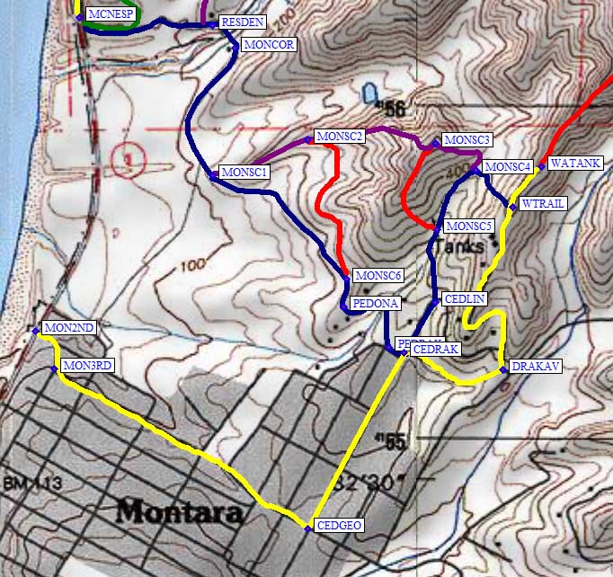 Leave Hwy 1 at the north end of the city of Montara, across from the Montara State Beach parking area. Look for 2nd Street (waypoint MON2ND, a few blocks north of the filling station and inn), turn inland for one block to Main Street, and jog one block south to continue inland on 3rd Street (waypoint MON3RD). 3rd becomes George and intersects Cedar (at waypoint CEDGEO) - make a left on Cedar and go uphill to Drake (waypoint CEDRAK). Follow Drake to the right, then turn left on Alta Vista (waypoint DRAKAV). Alta Vista turns into a dirt road as it switchbacks up onto a narrow ridge, then follows the ridge north past some water tanks.
