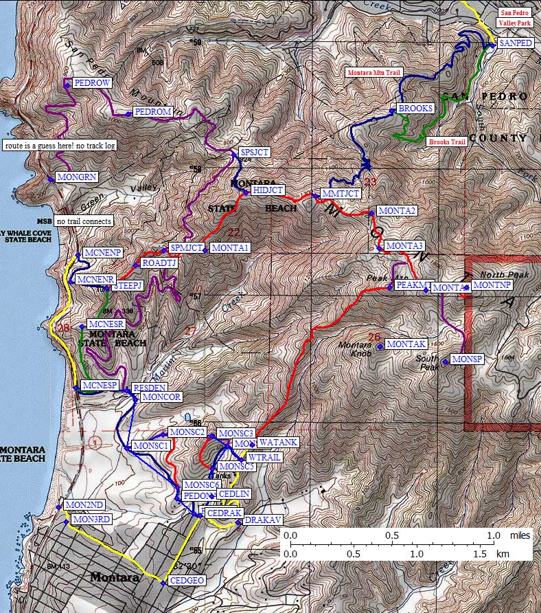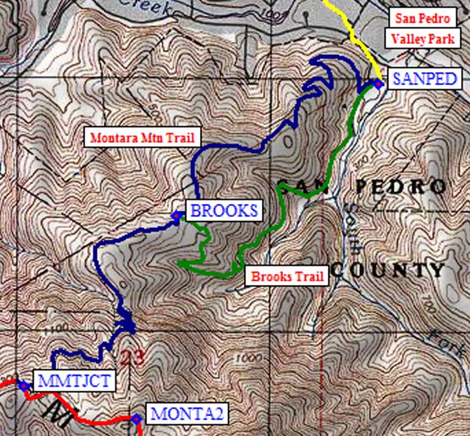 Head up the Montara Mountain Trail (shown in blue) directly from the San Pedro Valley Park Visitor Center (waypoint SANPED), or go via the Brooks Trail (shown in green, sort of near a brook) to join the Montara Mtn Trail at waypoint BROOKS. Keep going up on rougher trail to join the main dirt road (at waypoint MMTJCT) to access North Peak or McNee Ranch parking areas.