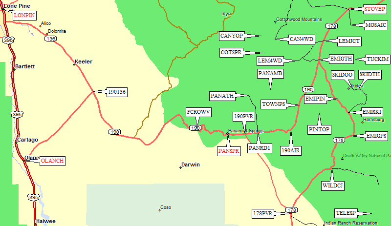 The trailheads below are west of Stovepipe Wells (waypoint STOVEP), in Death Valley. To get to any of them, you need to be on Hwy 190, well east of Olancha (waypoint OLANCH). See the Southern Panamint trailhead page for an optional approach up Hwy 178 through Ridgecrest and Trona (to waypoint 178PVR). On your way, stop at the Father Crowley Viewpoint (waypoint FCROWV) to take in the long views of Death Valley, gas up with expensive fuel at Panamint Springs (waypoint PANSPR), or if you have your own plane let me know if you can land at the local airstrip (waypoint 190AIR).