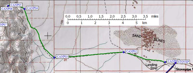 of the road (waypoint CAN4WD) it's supposed to be "a sandy slog up a boring sand hill" according to one well-known climber (not me). I've only climbed the other side, from Cottonwood Springs, so I'm not sure.