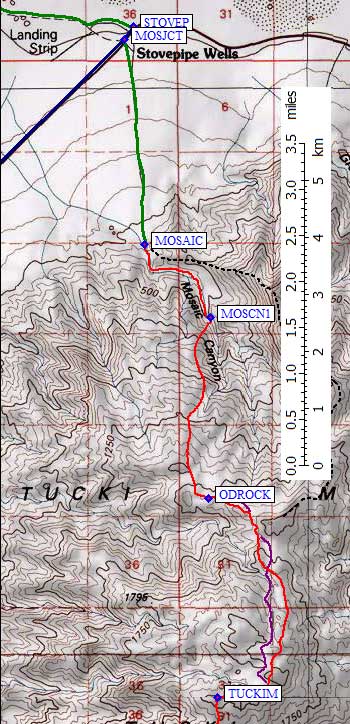 The bumpy rocky dirt road goes 2.3 miles south and ends at a parking lot. This area is day use only, but no one seemed to bother a car left there before dawn and picked up after dark in 2012. I did get a visit from the ranger when cleaning up and changing clothes after dark... he saw my lights and drove up to see what I was doing. Scores of tourists will be in Mosaic Canyon all day every day, but there's an exit from the canyon about a mile in. Just before the first waterfall look for ducks on the west side (waypoint MOSCN1) and climb an obvious use trail. When the use trail levels and drops back into the canyon above the waterfall, continue up cross-country for Tucki. It's a reasonable one-way hike from Mosaic Canyon to Skidoo. |