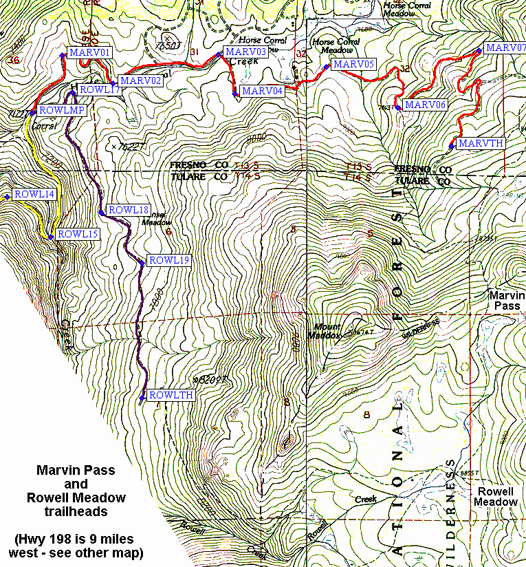 At waypoint ROWLMP, nine miles from Hwy 198, there once was a brown sign telling you about the two trailheads, but as of 2003 the sign was missing. There is now a sign saying 'Horse Corral Pack Station' to the right, which looks like a dirt driveway but is in fact the road to the Rowell Meadow trailhead. The paved road to the left leads to the Marvin Pass trailhead.