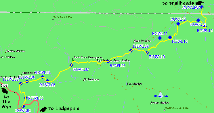 The junction at ROWLMP is where you choose between the Marvin Pass trailhead and the Rowell Meadow trailhead. On the trailhead map below, this junction is where the three colored lines meet.