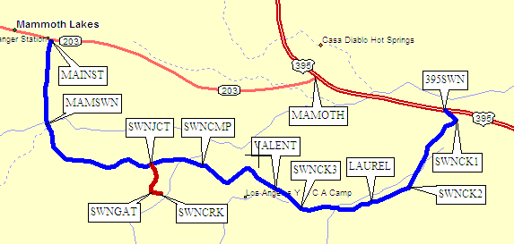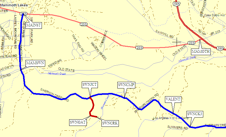 Continuing in this direction, Sherwin Creek Road ends at Old Mammoth Road (waypoint MAMSWN), which comes takes you to Hwy 203 (waypoint MAINST) also called Main Street in Mammoth Lakes. Follow this road east 2.8 miles to Hwy 395 (waypoint MAMOTH).