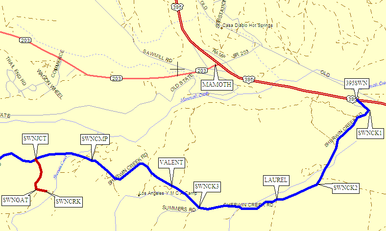 Continuing in this direction, Sherwin Creek Road comes out on Hwy 395 (waypoint 395SWN), 1.5 miles east of waypoint MAMOTH. This portion of the road is very rough, but quite drivable with any vehicle. Washboards keep your speed down so it's probably faster to drive through Mammoth Lakes except for the Laurel Creek Trail.