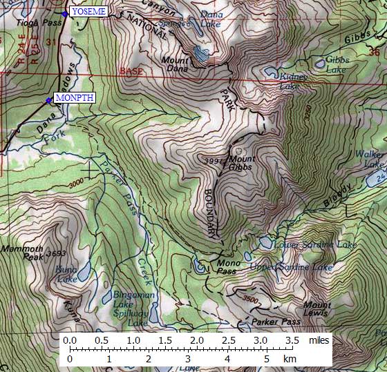The Mono Pass trailhead (waypoint MONPTH) leads from Dana Meadows