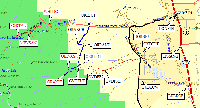 Take the Whitney Portal Road west from the stop light in the center of Lone Pine (waypoint LONPIN). 3.1 miles from Lone Pine continue straight (west) past Horseshoe Meadows Road (waypoint HORSEJ) if you're headed to the Mt Whitney trailheads. Just after the Olivas Ranch turnoff (waypoint ORRJCT, 5.6 miles from Lone Pine) there is a "No Snow Removal" sign. The road remains open beyond here in the winter, but you may get snowed in.