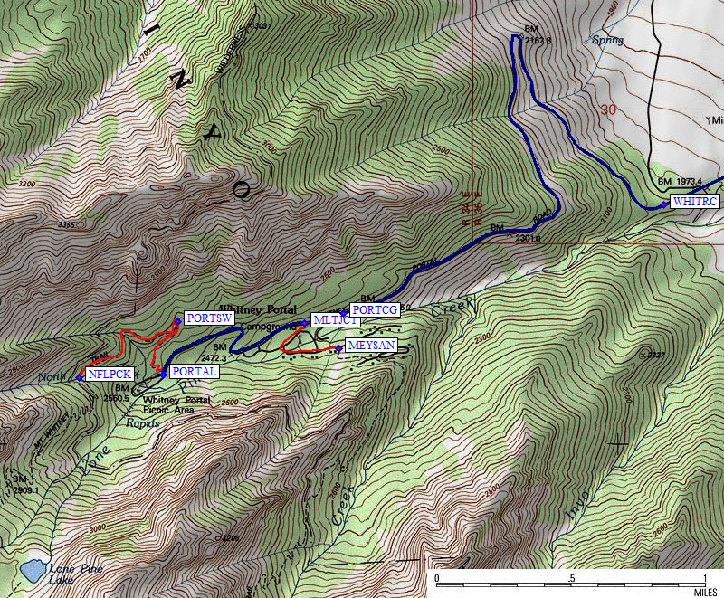 The Whitney Portal Campground (waypoint PORTCG) is the first turnoff beyond the huge switchback above the winter road closure. Less than a quarter mile beyond that campground turnoff there is a signed turn to Meysan Lakes Trailhead Parking. The trail up to Meysan Lake (for peaks like LeConte and Lone Pine) starts in a campground just downhill from the portal road (waypoint MEYSAN at 7.9k) and goes through an isolated pocket of private housing before following Meysan Creek up the drainage just south of the Whitney trail.