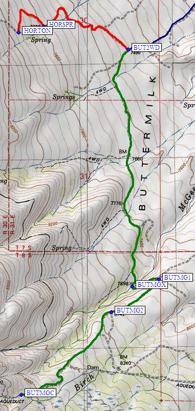 Secor says the Horton Lake Trailhead is 1.1 miles from waypoint BUT2WD, and indicates there should be parking near the spring at elevation 7777' (waypoint HORSPR). Apparently there is limited parking at the Horton Lake Trailhead itself (waypoint HORTON, just under 8000'). Secor also says the Buttermilk's own McGee Creek Trailhead (not the trailhead next Hilton Creek) is 3.1 miles from waypoint BUT2WD. Turn left at the Horton Lake sign mentioned above, and go 1.6 miles south to cross McGee Creek at 7898' (waypoint BUTMGX). Climb out of the drainage and make a hairpin turn at the BUTMG1 junction, then go southwest uphill to the fork at BUTMG2 (leaving Buttermilk Road). Keep going southwest (straight) to the end of the road at BUTMGC, the Buttermilk McGee Creek Trailhead at 8700'. Note that this trailhead is initially closer to Birch Creek than to McGee Creek, but does cross into the McGee drainage. |