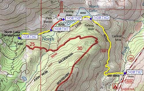 the South Lake (waypoint LAKJCT). Turn right (west) at the North Lake junction