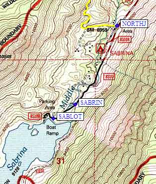 junctions (the red line). The main Lake Sabrina trailhead is at waypoint SABRIN,