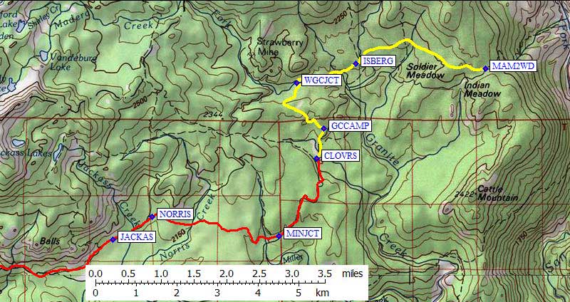 and Norris Lake (waypoint NORRIS) trailheads, which head north to the