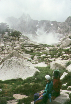 Not to beat a dead horse, but Secor's description of the traverse from LeConte to Corcoran says to start at the top of the Waterfall Pitch. Well, not really. The obvious ledge to traverse on is 50 feet above the top of the Waterfall, and is now marked by a better duck than the one we found. From there on, the route description is perfect (including the warning about staying too high, which we did in one chute). Secor says it requires skilled route finding, but I don't think it's all that hard to find. Most of it is second class, with an occasional third class move here and there. Leave your rope behind.