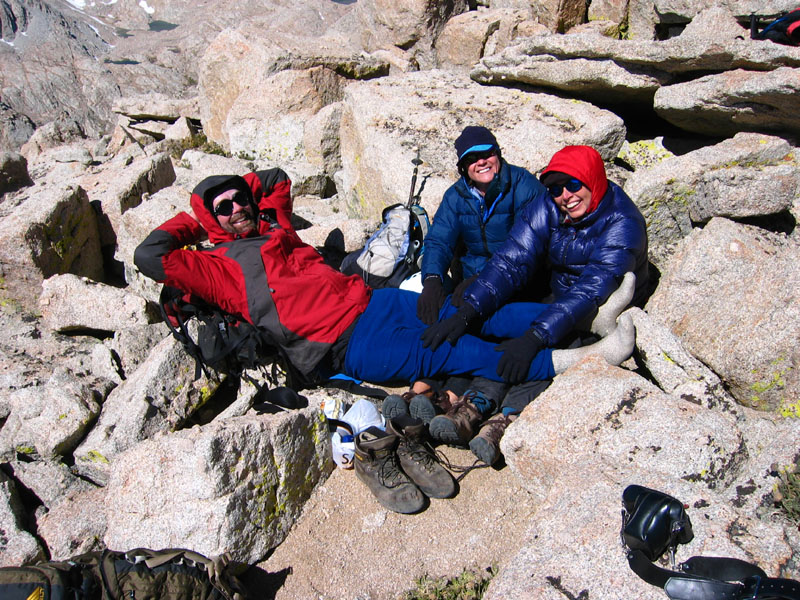 Steve Gets Thawed Out On Corcoran Corcoran's summit was blustery, but much warmer than the shaded chute. Fearing my fleece pants would never dry out, I put them on while they were still frozen stiff. Yikes! Huddled between the rocks, in the sun but not warm, Linda and Lisa offered to help thaw me out. Daryn just took the picture.
