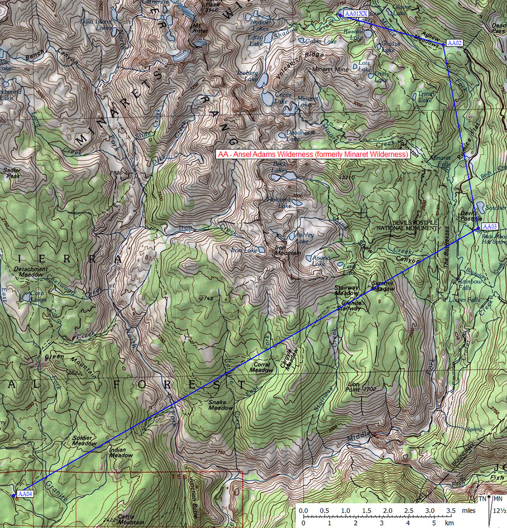 Detail Map of waypoint AA02 in Ansel Adams Wilderness (formerly Minaret Wilderness):