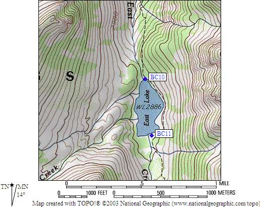 several hundred yards west of the trail - DON'T cross the outlet stream.