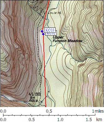 Follow a spur trail marked with a sign 'campsites' to the east (the trail turns to the northwest). There is a campsite and a standard box, (KC02) and if you keep going there is another campsite and box (KC03). As you walk in on the above trail you see a 'toilet' sign pointing to your right before reaching KC02. The toilet is perhaps 100 ft down this second trail.