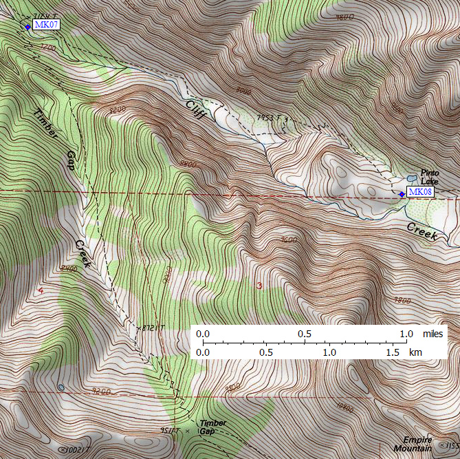 and about 20 yards northeast of Cliff Creek. There are campsites near