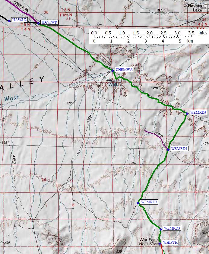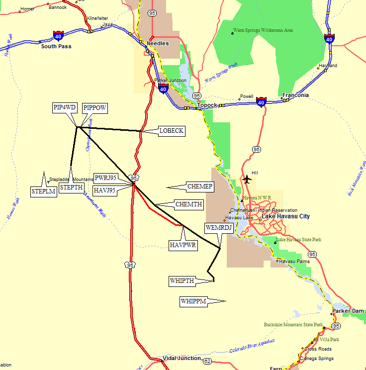 Whiple is approached via the powerline maintenance road, but what the DPS Guide won't tell you is that there are TWO places you can get on this fine high-speed dirt road. The fast approach starts where the Havasu Lake Road ends at US Hwy 95 (waypoint HAVJ95). If you're doing Chemehuevi also, you can take the powerline road all the way from US Hwy 95 (waypoint PWRJ95). Either way, find the place where the powerline crosses Havasu Lake Road (waypoint HAVPWR) about 10 miles southeast of US Hwy 95. Both approaches are fine for passenger cars.