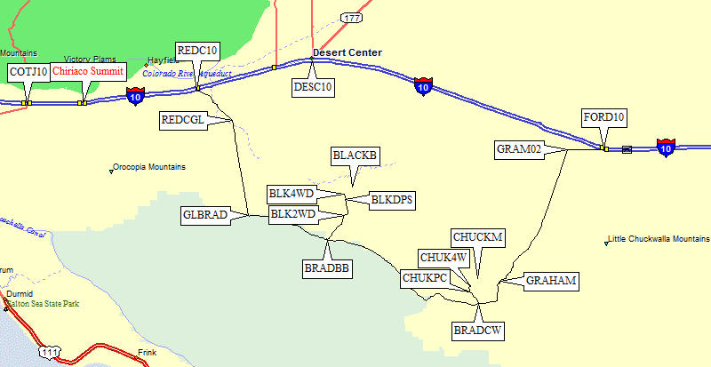 Take Road 594 east from BRADCW until it turns north (waypoint GRAM07) and climbs over Graham Pass (waypoint GRAHAM). The road straightens and goes northeast to a T intersection where there is a large green sign for Chuckwalla Road (waypoint GRAM02). You're back to pavement about 16 miles from the Chuckwalla turnoff. Turn right (east) on Chuckwalla Road and drive 3 miles to the Ford Dry Lake exit from I-10 (waypoint FORD10).