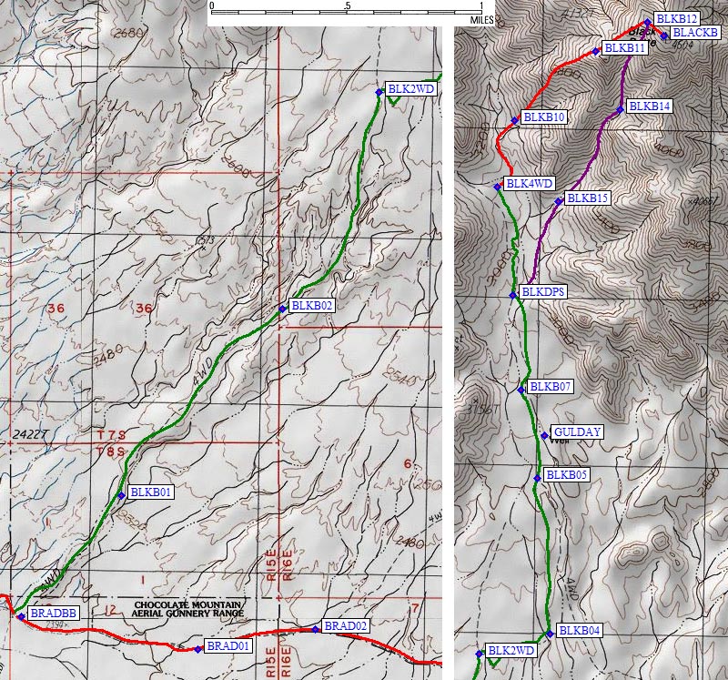 The map shows an actual GPS track log in green. 50 yards from Bradshaw, the road becomes more obvious. Over 2 miles from Bradshaw (but before BLK2WD) there is a sign saying This road forms the wilderness boundary on left. Must stay within 30' of centerline of road. It is apparently OK to camp anywhere on he right (east) side of the road, or near the road on the left (west).