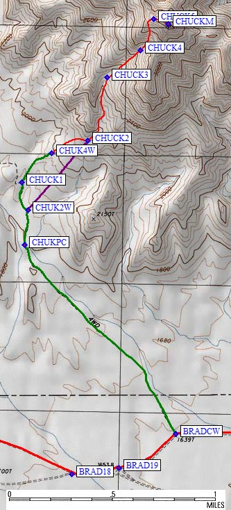 Passenger cars can do part of Chuckwalla, even though it seems cross country. Cars should approach from Graham Pass, not from Black Butte, for far better roads. There is room to park cars just before a dip (waypoint CHUKPC at 1.8k, 1.2 miles from Bradshaw Trail). Less than a quarter mile beyond that is the DPS 2WD trailead (waypoint CHUK2W), where there is lots more parking. It is hard to figure out where the road goes: The main road turns left out of 2WD parking area, another spur road goes uphill and dead-ends, and there are mining mounds everywhere. I think the DPS Guide is wrong or out of date, so I'm indicating the 4WD trailhead where I was able to drive in 2010. From CHUK2W, continue north-northeast on what looks like the main road. At the junction shown on USGS maps (waypoint CHUCK1, 1.5 mi from Bradshaw Trail) the main road goes left and downhill, but a much smaller track goes uphill. I parked at waypoint CHUK4W (2k, 1.7 miles from Bradshaw). This was not at the end of the road but where rocks and trees make the road somewhat impassable. You could push on another tenth of a mile, but it's not worth the effort and the road turns on a side slope so there's no place to park up high. |