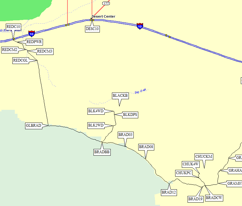 Drive east of Indio on I-10, 14 miles beyond the Joshua Tree exit (waypoint COTJ10) and 10 miles before Desert Center (waypoint DESC10). Exit at the large green sign for Red Cloud Road (waypoint REDC10) and find the large parking area south of the freeway. If you're driving west, you'll have to loop under the freeway west of the exit and go back east to join the eastbound exit ramp. At the south end of this parking lot there is a sign for Red Cloud Road, which goes southeast. Cross under the powerline (waypoint REDPWR) on a dirt road that is still OK for passenger cars.