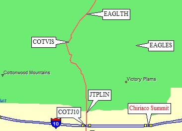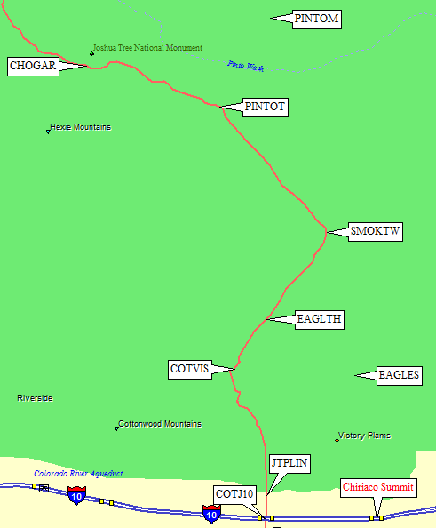 Halfway between Indio and Desert Center on I-10 (23 miles from each of them), exit at Cottonwood Springs Rd, the turnoff for Joshua Tree National Monument (waypoint COTJ10). This is the first exit west of Chiriaco Summit. For Orocopia, go south toward Mecca. For Eagle and Pinto, go north into Joshua Tree. (Continuing north will take you to Hwy 62 near Twentynine Palms, 45 miles from I-10.)