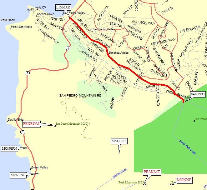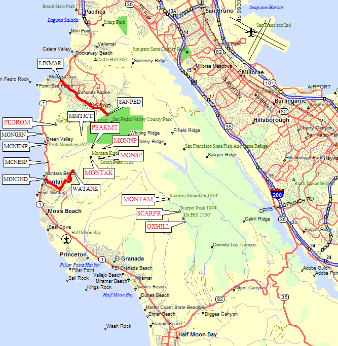 There are four trail GPS routes in this file, plus one 'route' containing all the labeled high points on Montara Mountain: City of Montara trailheads, McNee Ranch North Approach, McNee Ranch South Approach, San Pedro Valley, and San Pedro Mountain. A detailed topo map and descriptions are below, and a road map is above: