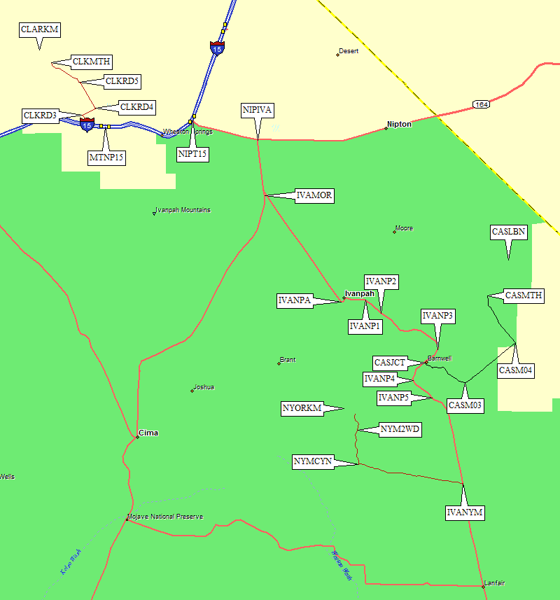 a powerline (waypoint IVANPA, 13 mi from I-15). The road turns left (east), then bends southeast