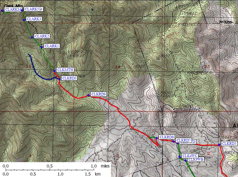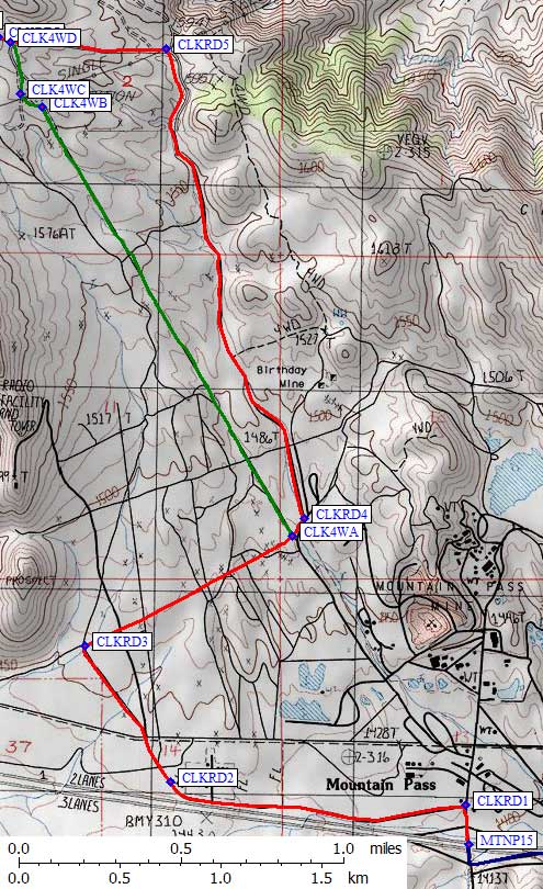 right about 1.5 miles from I-15 (waypoint CLKRD3), the USGS map incorrectly shows