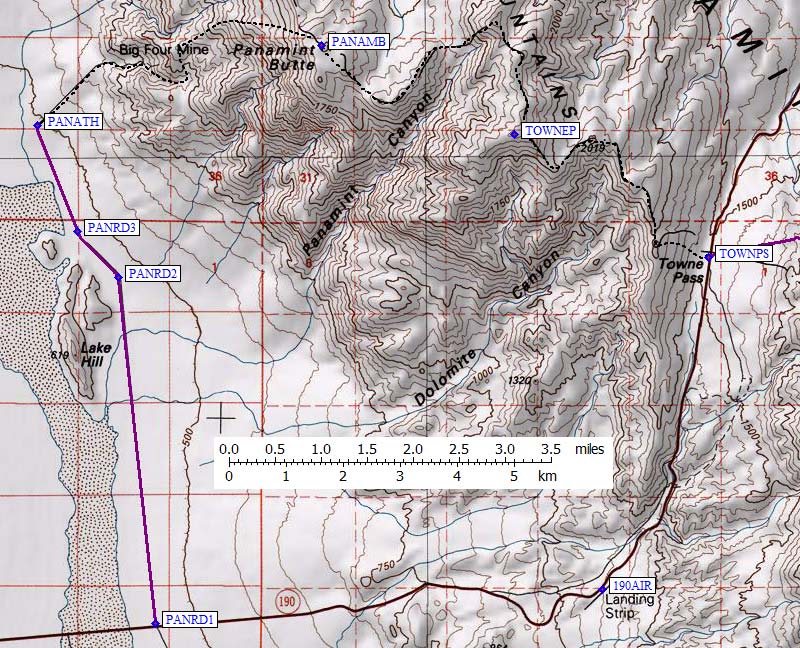 The trailheads below are west of Stovepipe Wells (waypoint STOVEP), in Death Valley. To get to any of them, you need to be on Hwy 190, well east of Olancha (waypoint OLANCH). See the Southern Panamint trailhead page for an optional approach up Hwy 178 through Ridgecrest and Trona (to waypoint 178PVR). On your way, stop at the Father Crowley Viewpoint (waypoint FCROWV) to take in the long views of Death Valley, gas up with expensive fuel at Panamint Springs (waypoint PANSPR), or if you have your own plane let me know if you can land at the local airstrip (waypoint 190AIR).
