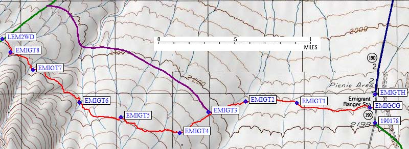 I've walked the red and purple lines between EMIGTH and LEM2WD, and the red line is an actual GPS track log of what I think is the best route. A use trail leaves from the campground (waypoint EMIGCG) and is worth finding and following. I turned up a wash at waypoint EMIGT2, which I followed to EMIGT4 before striking out cross country. The lower traverse (purple line) deals with more boulders and sharper erosion gullies. The biggest obstacle is a steep-sided wash, which I picked my way across at EMIGT5. Drop to EMIGT6 and traverse to the road on a use trail. On the way out, look near the parking area (LEM2WD) for a steel post (waypoint EMIGT8) and pick up the use trail there.
