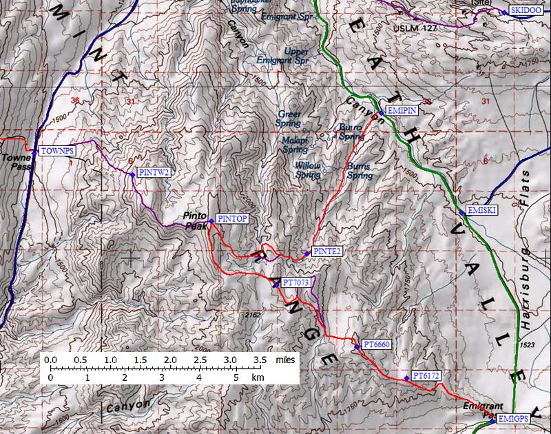 Below are approaches from the west (Towne Pass), the east (Burns Spring) and the southeast (Emigrant Pass).