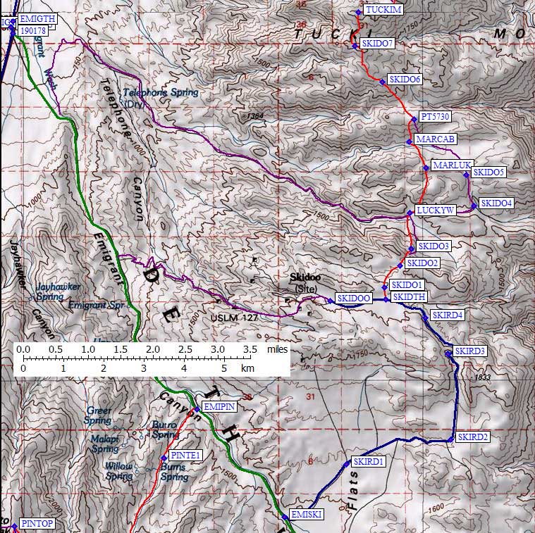 The route goes over a low saddle into Lucky Wash, then around or over another ridge to Martin Crossing, and finally up to Tucki. It might be possible to drive to Martin or Lucky, so let me know if you've done that. It's a reasonable one-way hike from Skidoo to Mosaic Canyon.