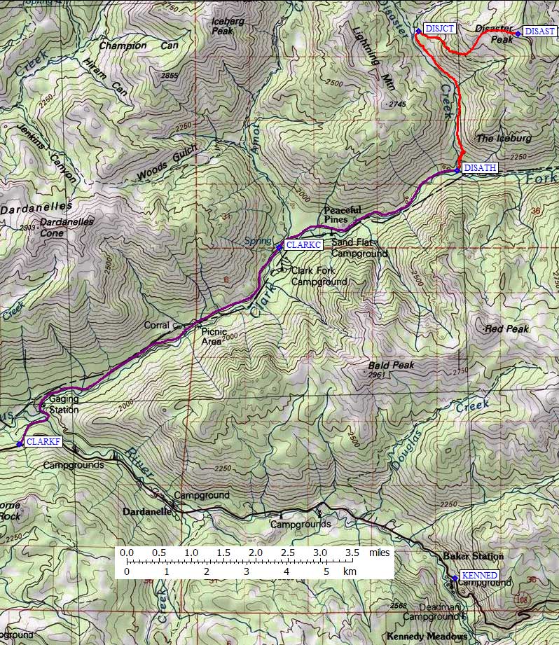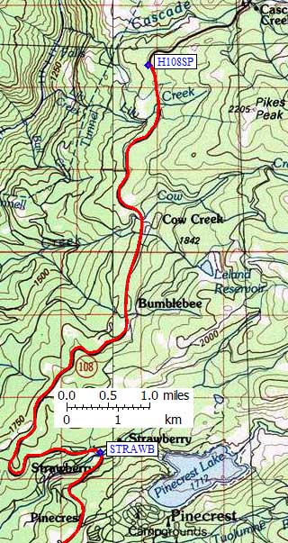 From the Hwy 120 / Hwy 108 junction (waypoint 120108), continue on highway 108 past the town of Sonora, Pinecrest, and Dardanelle (waypoint DARDAN). There are seasonal services at Dardanelle, including a gas station, cafe, and a small general store. Kennedy Meadow (waypoint KENMDW) is off Hwy 108, 5 miles beyond Dardanelle, 29 miles beyond Pinecrest, and 56 miles beyond Sonora.